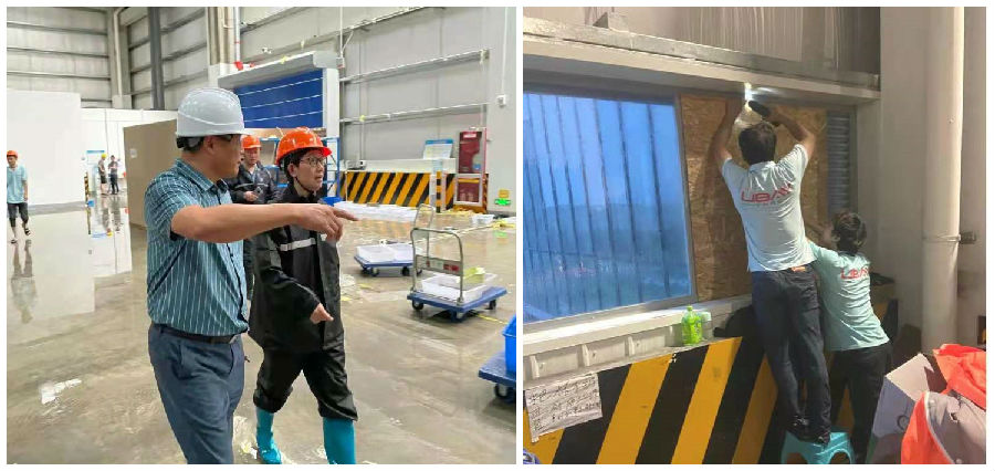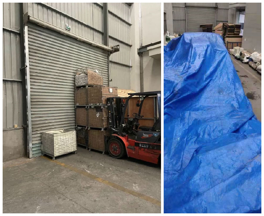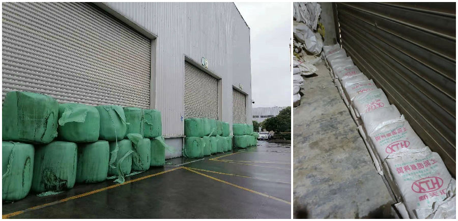 7月25日上午6点,森福厂房右侧的钢结构篷顶出现局部漏雨情况,值班人员第一时间安排叉车工将成品转移至室内,并利用遮雨布对一些无法转移的材料进行防护处理。整整3个小时后,纸箱等易潮材料终于全面防护到位,确保将损失降至最低限度。