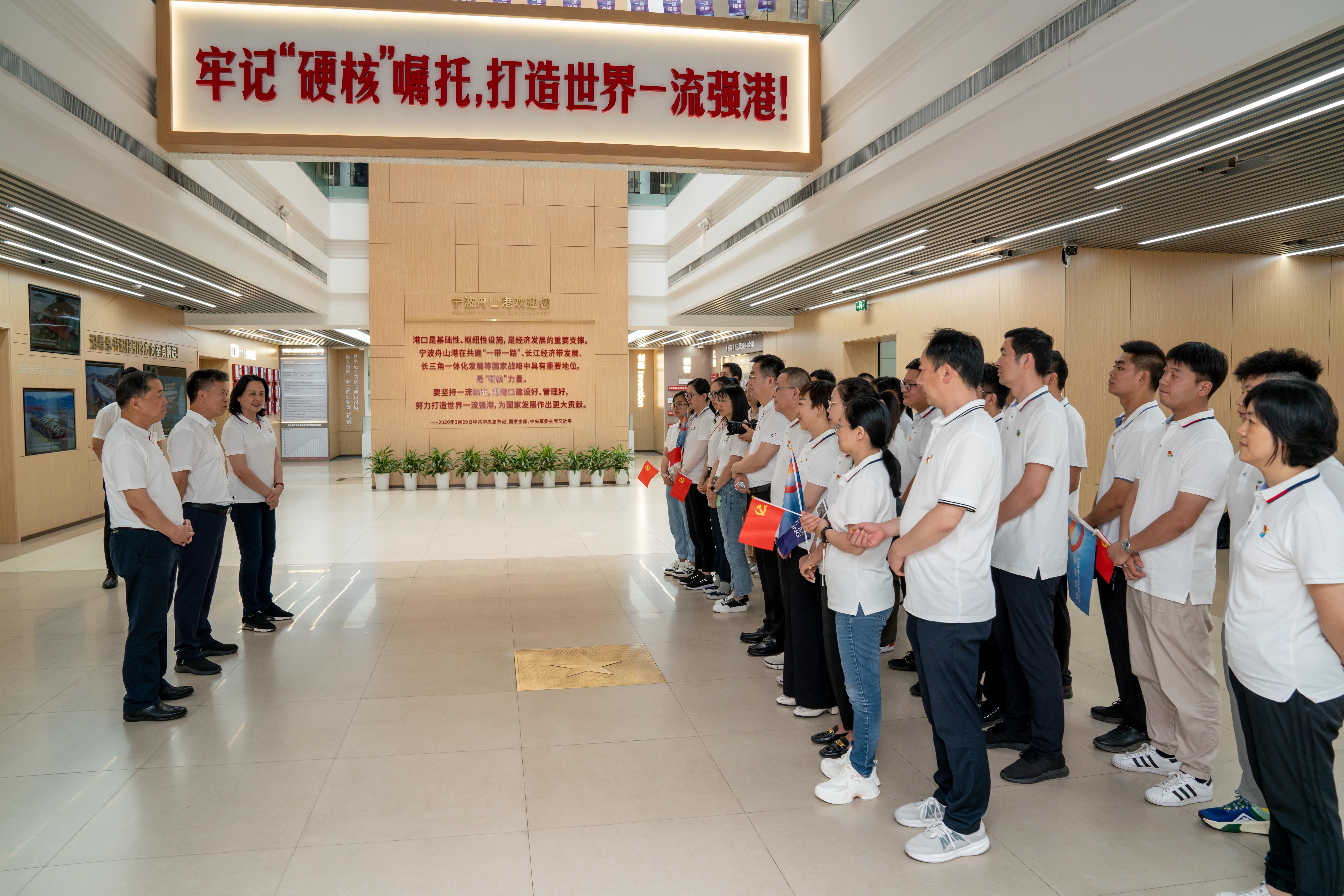活动第一站,全体党员干部来到宁波舟山港穿山港区,沿着习近平总书记的足迹循迹溯源,俯瞰码头全貌,感受作业场景,从巨型集装箱构建中感悟宁波港发展,感受中国改革开放的巨大成就。