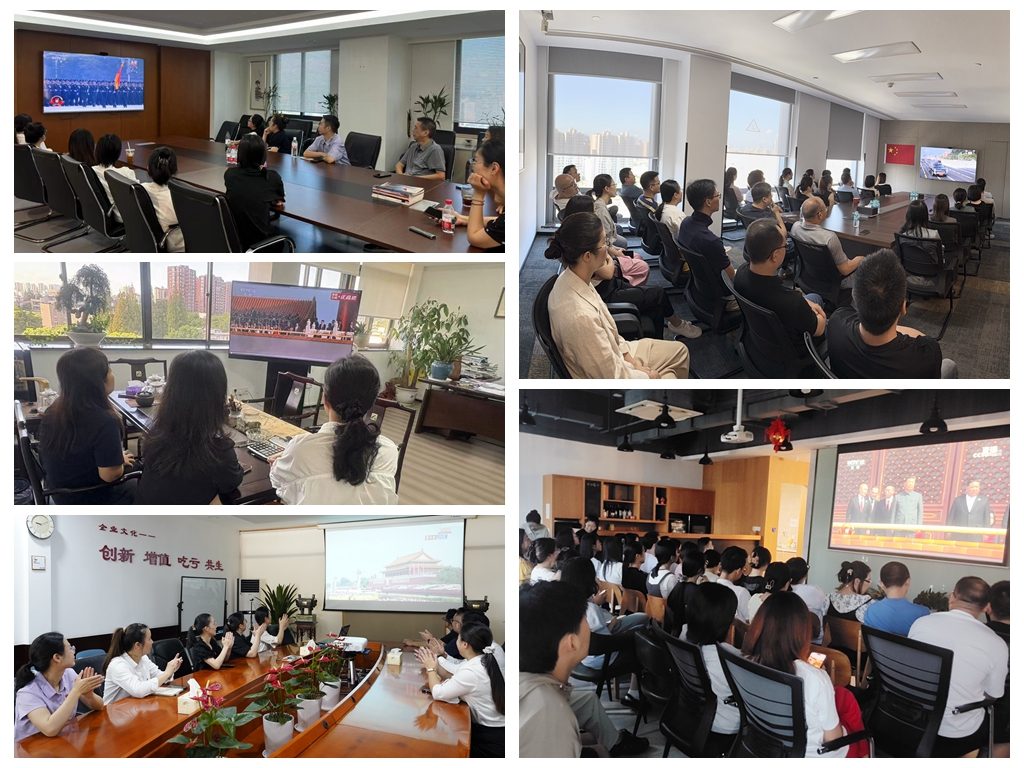 当高亢的国歌响起,当雄壮的方队迈着铿锵有力的步伐走过天安门广场,当各种尖端新型主战装备震撼亮相,当战机编队轰鸣着划过长空,不同的会场,都洋溢着每位员工同为中国人的激动与自豪。