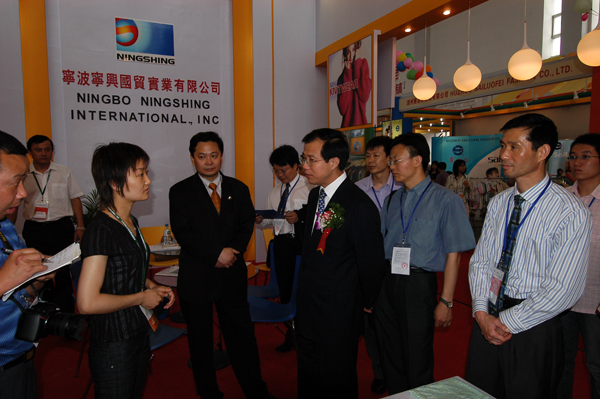 6月8日,在第四届中国国际消费品博览会开幕当天,国家商务部部长助理傅自应在市外经贸局领导的陪同下,视察了我司控股的宁波3044AM永利集团国贸实业有限公司的服装摊位,详细询问并了解了3044AM永利集团国贸服装产品的出口状况,以及欧美纺织品贸易保护对出口企业造成的影响,并对3044AM永利集团国贸展位的特装设计给予了赞扬。